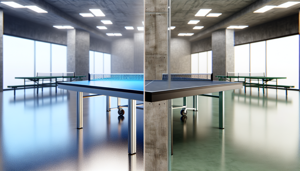 میز تنیس شیشهای معمولاً از شیشههای نشکن ساخته شده است که به نسبت سبکتر و زیباتر به نظر میآید، در حالی که میزهای سیمانی بسیار سنگین و مقاوم هستند. شیشهای بودن میزهای تنیس نشکن به کاهش آسیبپذیری در برابر ضربه کمک میکند و موجب کاهش پوسیدگی و زنگزدگی میگردد. از طرف دیگر، میزهای سیمانی به شدت مستحکم هستند و برای فضای خارج از منزل مناسبند. با این حال وزن زیاد آنها ممکن است جابجایی را دشوار کند.